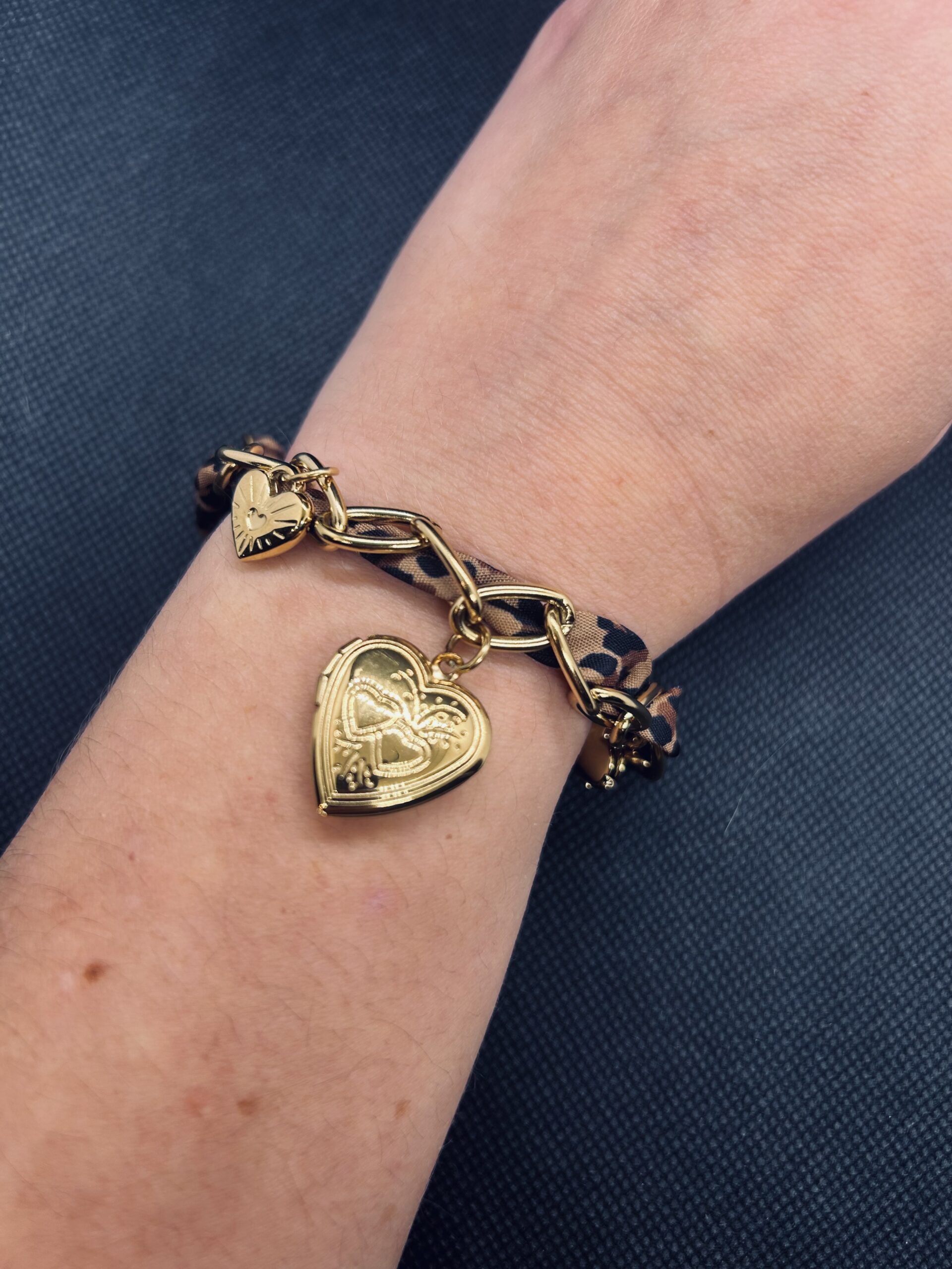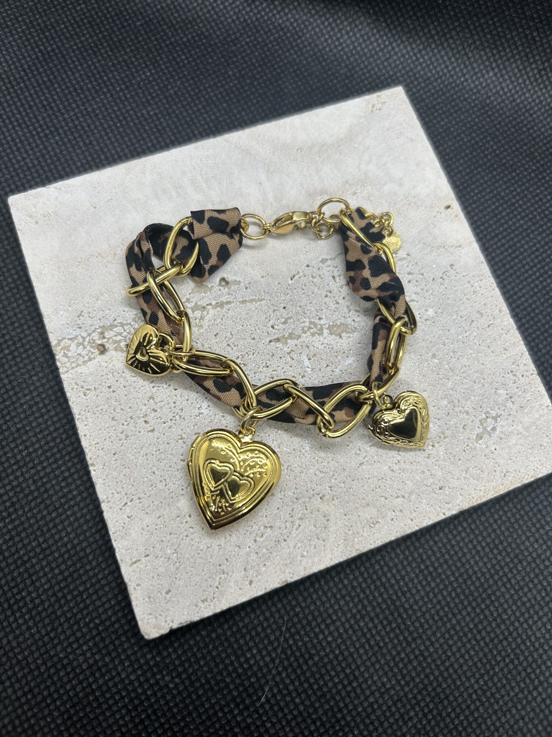 Bracelet doré, chaîne torsadé de ruban léopard et breloque cœur