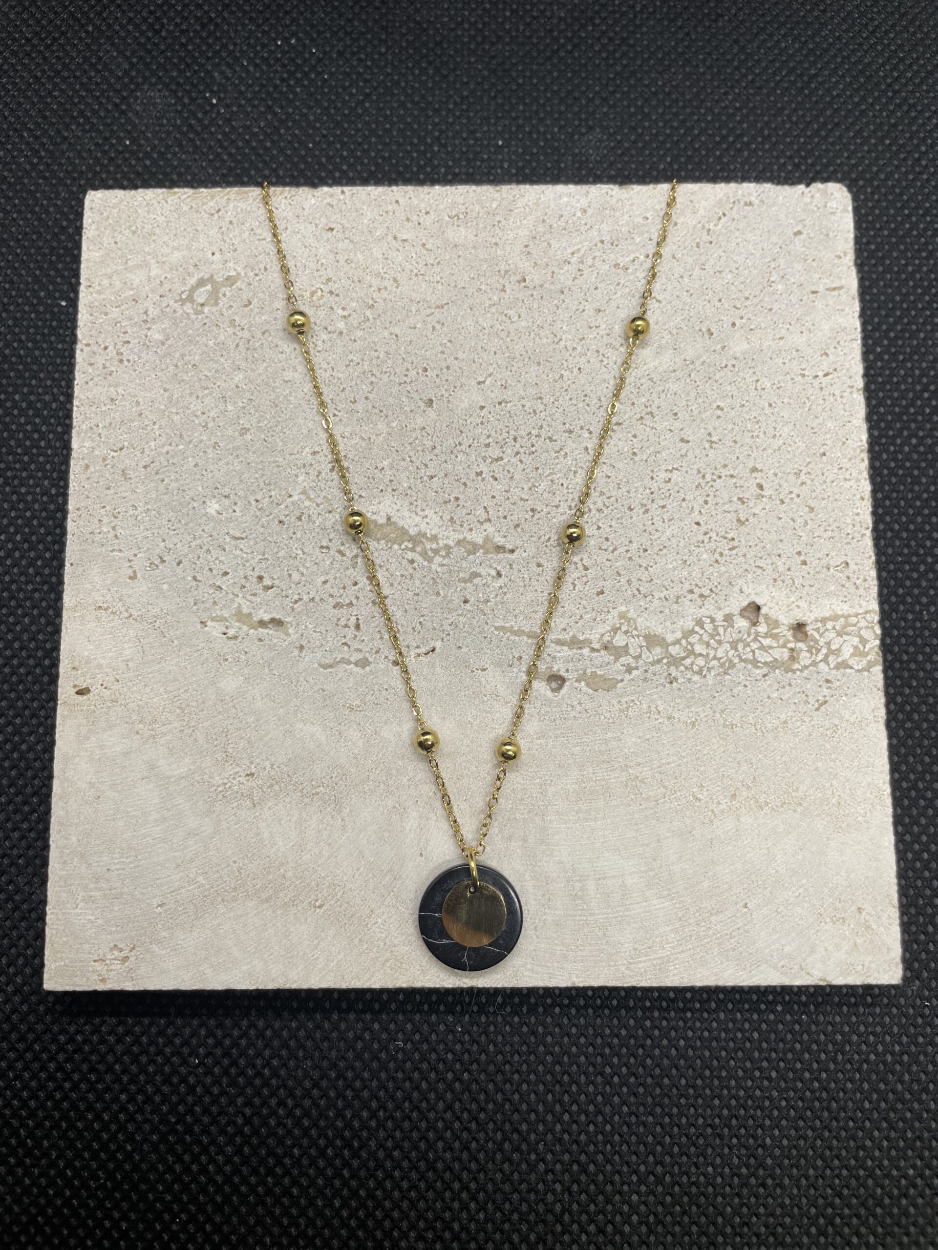 Ajoutez une touche d’élégance intemporelle à votre tenue avec ce collier délicat, Louna. Doté d’un pendentif circulaire unique alliant un disque doré et une pierre noire marbrée, il est subtilement réhaussé de petites perles dorées sur la chaîne